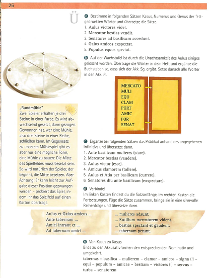 Übung a:Aulus victores videt -> Akk. Pl. mask. Aulus sieht die Sieger Mercator bestias vendit -> Nom. Sg. mask. Der Händler verkauft wilde Tiere Senatores ad basilcam accedunt -> Akk. Sg. fem. Die Senatoren treten an die Basilika heran Gaius amicos expectat -> Akk. Pl. mask. Gaius erwartet die Freunde Populus equos spectat -> Nom. Sg. mask. Das Volk betrachtet die Pferde Übung b:mercatorem / mercatores mulierem / mulieres equum / equos clamorem / clamores portam / portas amicum / amicos amicam / amicas forum / fora senatorem /senatores Übung c:Ante basilicam mulieres stant (stare) Mercator bestias vendit (vendere) Aulus victor est (esse) Amicus clamorem tolli (tollere) Aulus et Atia per basilicam currunt (currere) Senatores diu ante basilicam exspectant (exspectare) Übung d:Aulus et Gaius amicus ... mulieres adsunt Ante tabernam ... Rutilium mercatorem vident Amici intrant ... bestias spectant et gaudent Ad tabernam amici ...tabernam petunt Aulus et Gaius tabernam petunt. Ante tabernam mulieres adsunt. Amici intrant,bestias spetant et gaudent. Ad tabernam amici Rutilium mercatorem vident. Übung e:tabernas - tabernae basilia - basilicam mulierem - mulier clamor - clamorem amicos - amici signa(!) - signa equi - equos populum - populus amicae - amicas bestiam - bestia victores(!) - victores servus - servum turba - turbam senatorem - senator |